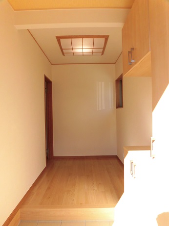 和洋折衷の玄関は十分なスペースがあるので、容量の大きい玄関収納を設置し、すっきりと片付きます。